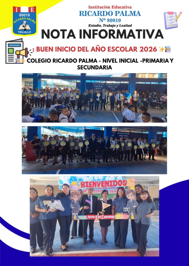 La Institución Educativa N° 80010 Ricardo Palma de Trujillo le saluda cordialmente, le agradece por su visita a nuestro portal, donde encontrará información importante y de interés sobre los servicios que brindamos a la comunidad Trujillana, en bien de la formación integral de nuestros niños, niñas y adolescentes.